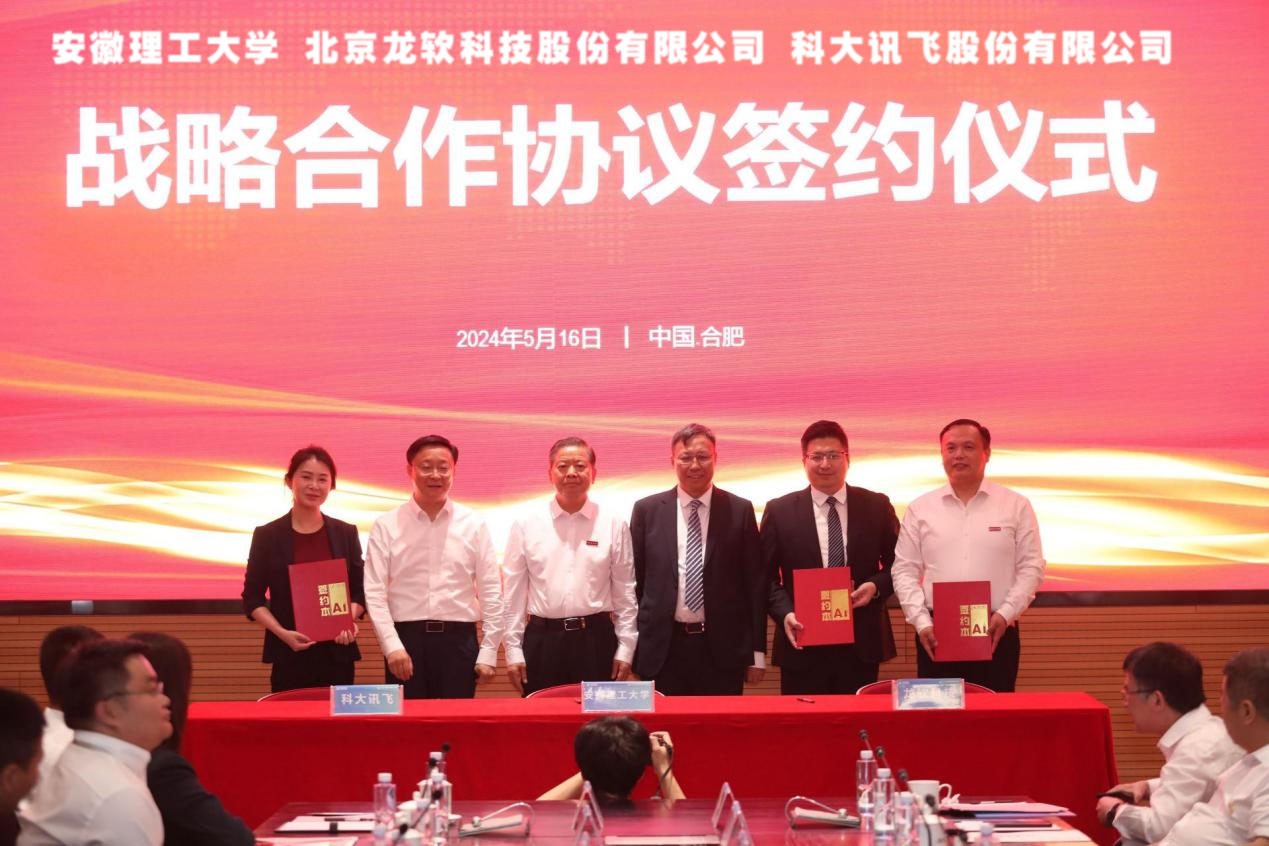 安徽理工大學科研部負責人劉輝,龍軟科技董事、副總經(jīng)理高志譽,科大訊飛副總裁、安徽大區(qū)總經(jīng)理李紅明分別代表三方簽約。中國工程院院士、安徽理工大學黨委副書記、校長袁亮,北京大學教授、龍軟科技董事長毛善君,科大訊飛董事長劉慶峰等出席并見證簽約。