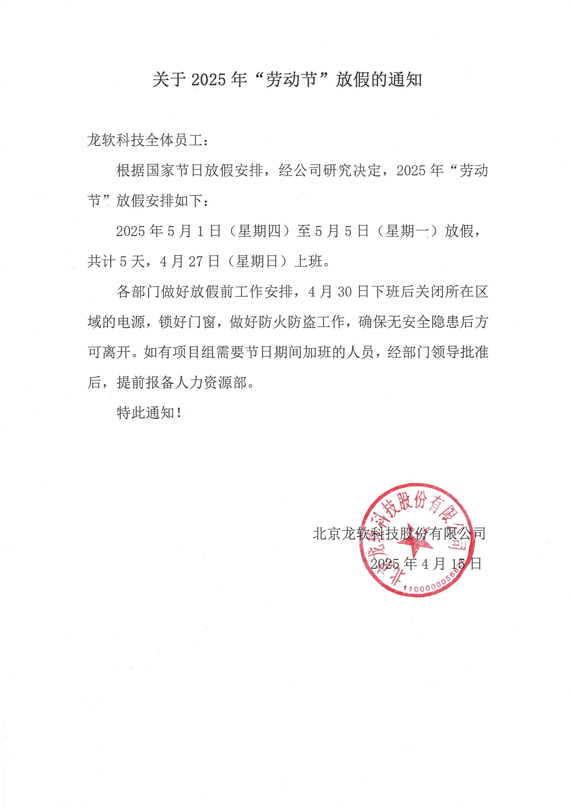 關(guān)于2025年“勞動節(jié)”放假的通知