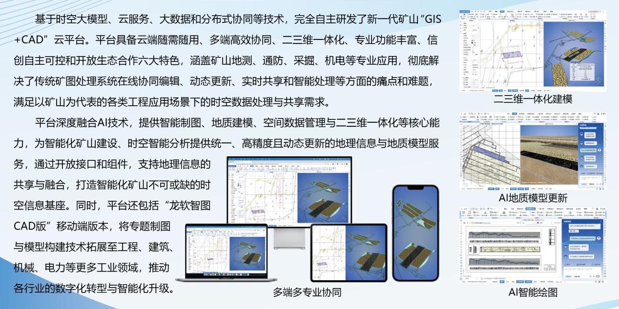 龍軟智圖作為公司自主研發(fā)的核心產(chǎn)品,已實(shí)現(xiàn)對(duì)國(guó)外同類軟件的進(jìn)口替代,成為國(guó)內(nèi)煤炭行業(yè)重要的基礎(chǔ)工業(yè)軟件。目前已在超過80%的國(guó)有大中型礦井應(yīng)用,累計(jì)服務(wù)1800余家單位。為更好地賦能行業(yè)人才培養(yǎng),龍軟科技計(jì)劃在全國(guó)煤炭行業(yè)現(xiàn)代遠(yuǎn)程教育培訓(xùn)網(wǎng)發(fā)布最新版龍軟智圖,供廣大學(xué)員免費(fèi)學(xué)習(xí)。同時(shí),也將向各礦山企業(yè)培訓(xùn)部門、相關(guān)高校免費(fèi)授權(quán)使用,助力行業(yè)構(gòu)建更普惠、高效的培訓(xùn)工具生態(tài)。