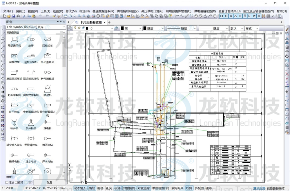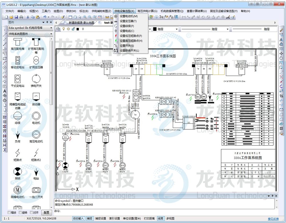 供電設(shè)計(jì)圖形協(xié)同管理系統(tǒng)包括機(jī)電圖形協(xié)同管理、供電設(shè)備選型計(jì)算和固定設(shè)備選型計(jì)算等模塊。機(jī)電圖形協(xié)同管理是基于一張圖管理模式,以在線協(xié)同的方式設(shè)計(jì)運(yùn)輸系統(tǒng)圖、設(shè)備布置圖、供排水系統(tǒng)圖、通訊聯(lián)絡(luò)系統(tǒng)圖、人員定位系統(tǒng)圖、供電系統(tǒng)圖等機(jī)電圖形。供電設(shè)備選型計(jì)算是基于標(biāo)準(zhǔn)的供電設(shè)備圖例庫繪制供電系統(tǒng)圖,對(duì)電動(dòng)機(jī)、變壓器、電纜、各類開關(guān)進(jìn)行相應(yīng)的供電計(jì)算與校驗(yàn),從設(shè)備參數(shù)數(shù)據(jù)庫選出合適的供電設(shè)備,并自動(dòng)生成供電設(shè)計(jì)報(bào)告。固定設(shè)備選型計(jì)算是對(duì)輔助運(yùn)輸巷絞車、運(yùn)輸機(jī)、排水等設(shè)備進(jìn)行選型計(jì)算,選出合適的設(shè)備,生成相應(yīng)的設(shè)備選型設(shè)計(jì)報(bào)告。