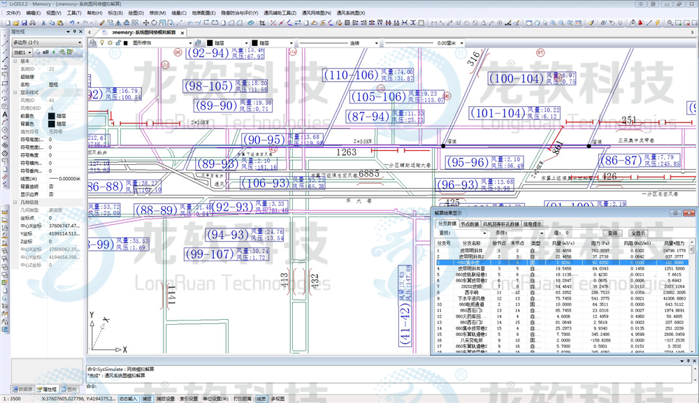 通防圖形協(xié)同管理系統(tǒng)主要包括通風(fēng)制圖和通風(fēng)系統(tǒng)仿真等模塊。通風(fēng)制圖包括繪制通風(fēng)系統(tǒng)圖、避災(zāi)路線圖、注漿系統(tǒng)圖、瓦斯抽放系統(tǒng)圖、瓦斯抽放曲線圖、防塵系統(tǒng)圖、防火系統(tǒng)圖、監(jiān)測(cè)監(jiān)控系統(tǒng)圖,自動(dòng)生成通風(fēng)系統(tǒng)立體圖、通風(fēng)網(wǎng)絡(luò)圖、通風(fēng)系統(tǒng)壓能圖;通風(fēng)系統(tǒng)仿真主要包括通風(fēng)阻力測(cè)定數(shù)據(jù)的錄入和處理,通風(fēng)網(wǎng)絡(luò)模擬解算,通風(fēng)系統(tǒng)風(fēng)量調(diào)節(jié),風(fēng)機(jī)優(yōu)化選型等功能。